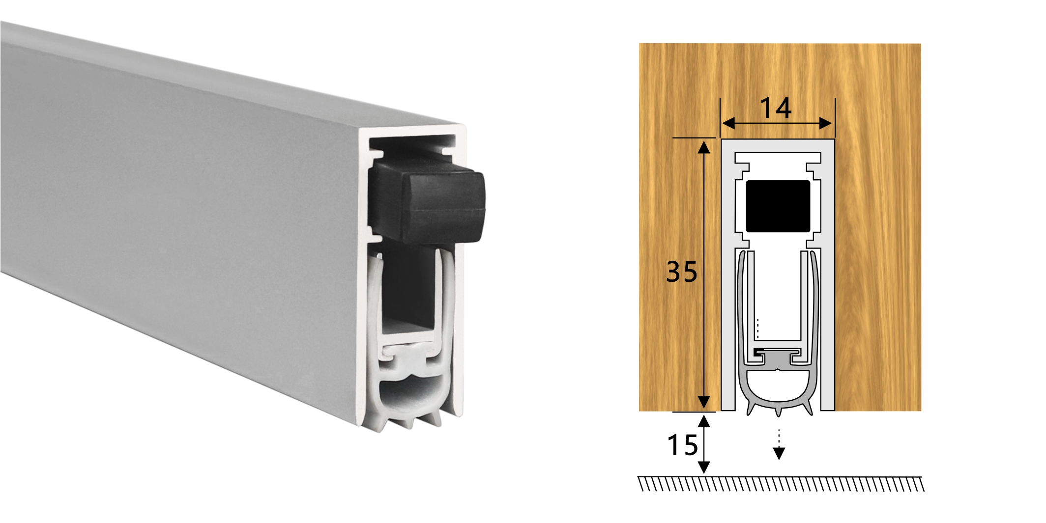 嵌入式門底自動升降式密封器,四連桿機構(gòu),適用于門扇內(nèi)開槽的門。安裝時需在門底加工一條35mm*14mm的通槽,將產(chǎn)品放置其中,將兩端蓋板和密封器用螺絲固定,使用本產(chǎn)品不影響門的整體風(fēng)格。
