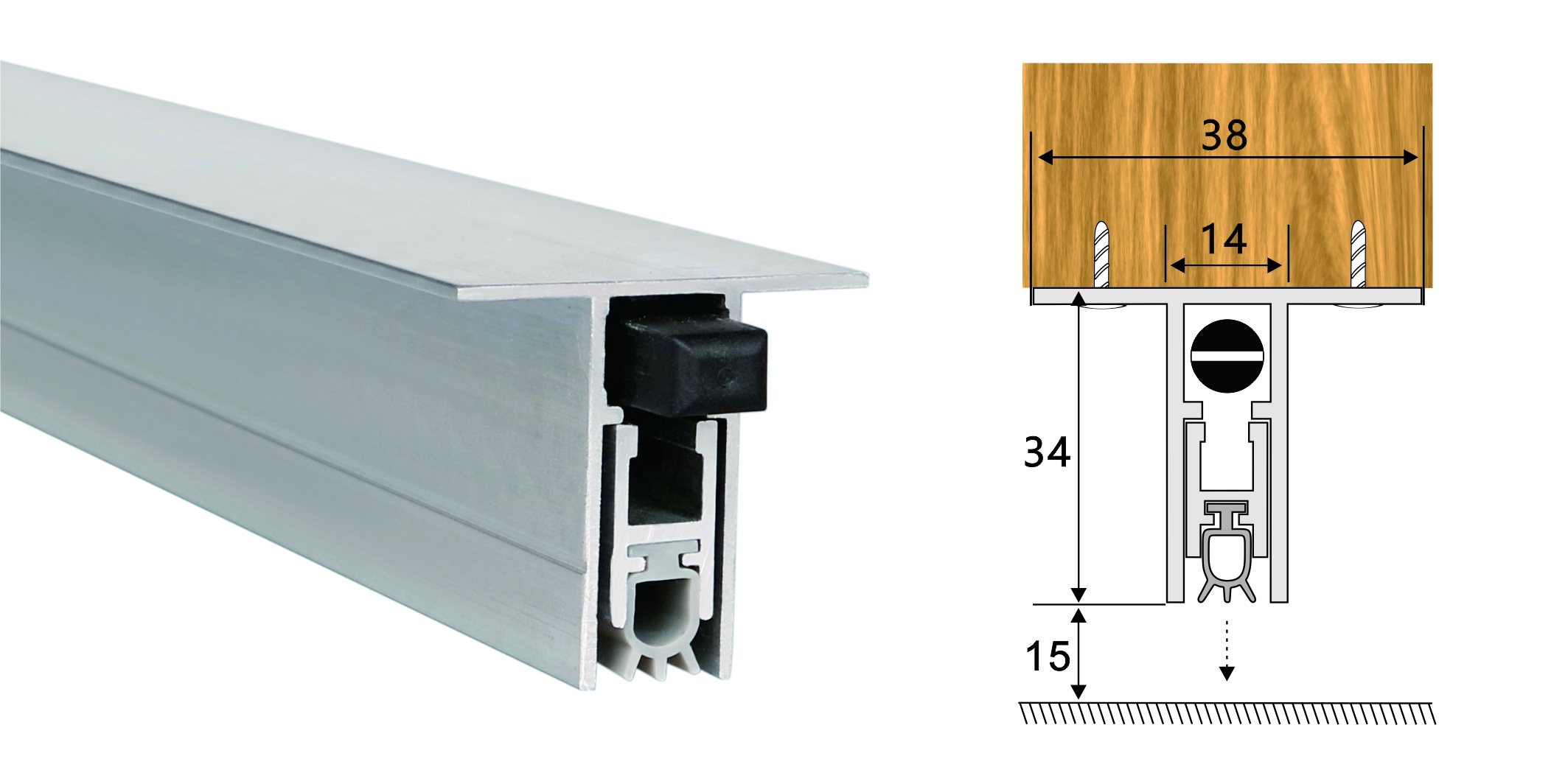 為省去門底開槽的工作,特別設(shè)計(jì)了B03的擴(kuò)展應(yīng)用的門底自動升降式密封器。只需設(shè)計(jì)時(shí)將門的高度做短34~35毫米,將自動門底條用螺絲從兩翼上直接固定,即可。其作用與B03一樣,密封條自動上升,膠條與地面無摩擦。